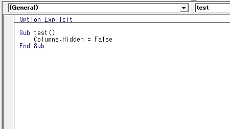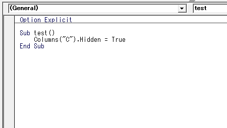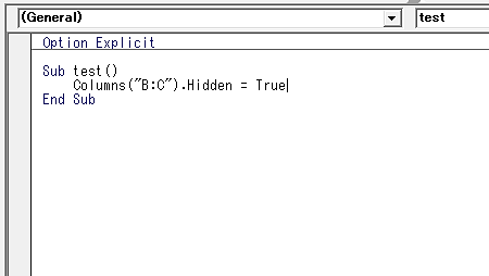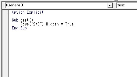 行や列の非表示、表示は「Hidden」プロパティを使います。